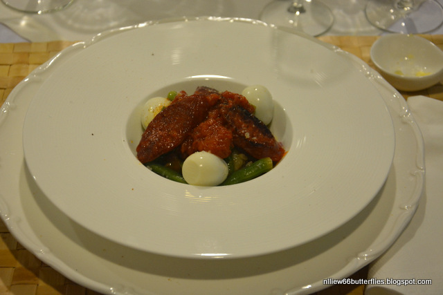 Warm French bean salad with Chorizo sausage and quail eggs.